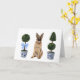 This greeting card features a watercolor portrait of a cute German Shepherd Dog sitting in between two chinoiserie style topiaries.