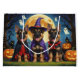 A playful Halloween scene featuring a mischievous little pup peeking out of a carved pumpkin, surrounded by spooky-fun fall vibes. With cheeky charm and autumn colours, it’s the perfect touch of humour for the season.