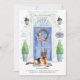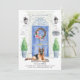 Announce your new address with our stylish announcement featuring a German Shepherd, blue front door, welcome mat, slate sign, topiaries and a floral wreath set on a grey brick background.