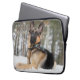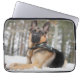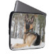 German Shepherd dog posing in the snow wearing a camoflaug coloured bandanna.