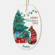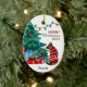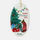On the front of this Holiday ornament is an image of a German Shepherd Dog dressed in a red and white winter time sweater. The dog sits gazing at a decorated Christmas tree with gift packages beside it. A string of lights is overhead. Your custom text is in 4 easy to change fields. The back of the ornament has the same image with two more text fields. Currently the back says "Happy New Year".