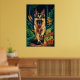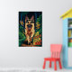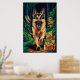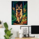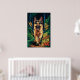A German Shepherd runs through a forest, its paws hitting the dirt path. The dog has a determined look on its face and its tail is wagging slightly. The words Lead With Strength, Follow With Heart are printed on the right side of the image.