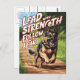 A German Shepherd dog runs down a dirt path, kicking up dust with its powerful paws. Above the dog are the words Lead With Strength, Follow With Heart.