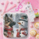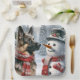 A German Shepherd wearing a red and white scarf stands beside a snowman with a top hat amidst a snowy landscape