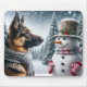 A German Shepherd wearing a scarf faces a cheerful snowman adorned with a hat and striped scarf in a snowy landscape background