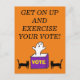 Get on up and exercise your vote! Spread the word and help get out the vote. A cute and frightening ghost is popping out of a box like a jack-in-the-box. Or is it a ballot box? Two black cats are looking on, waiting to cast their vote. Colours are orange, purple, yellow, white and black. Use the Halloween occasion to spread the message. Hand these out and mail these to friends and kin in important states! Our country is stronger when we all get out and vote, early and safely. Thanks for doing your part to strengthen our communities and promote democracy.