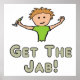 Get The Jab graphic shows a happy person with a thumbs up and a syringe encouraging people to get their jab. A pro vaccination design to promote take up of the vaccine.