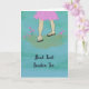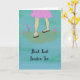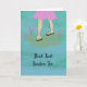 Hand painted and drawn get well card for a broken toe. The design is just legs of a woman with a violet skirt and flowers on a turquoise painted background.