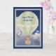 Get well card for children with a light green hot air balloon and a cute little monkey in the basket. The background is a dark blue cloudy sky. Perfect card to send to a child who is ill.