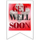 This bunting banner features a collection of white balloons over a red and white background displaying the words "Get Well Soon" with a red/black rose typograph style in this Get Well Soon theme. All banners have single sided printing outdoor safe and made with thick plastic rope has (16) 5.5" x 8" swallowtail flags on a 6' long string.