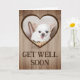 Get well soon cute puppy dog chihuahua photo in a basket custom card for your loved one who got ill. Personalise front text get well soon and inside: Wishing you a speedy recovery. Brown bamboo wood printed card with heart and white chihuahua sticking tongue out.