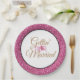 Party paper plate shown in a lovely Pink faux glitter print around the rim and White centre. Gettin' Married in a fancy script in centre with two Pink-coloured hearts.