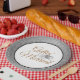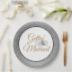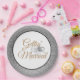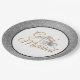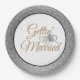 Party paper plate shown in a lovely Silver fine glitter print around the rim and White centre. Gettin' Married in a fancy script in centre with two interlinked hearts.