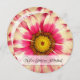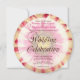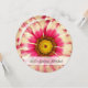 This round circular wedding announcement is a rustic country distressed hot pink daisy announcement with a brown vintage distressed background. One side has the words "We're Getting Hitched", and the other side has the wedding invitation wording. The text reads "Together with their families {bride and groom} request the pleasure of your company at their Wedding Celebration". The "Wedding Celebration" part of the text cannot be changed. The "Wedding Celebration" text is in a large script font making it the focal point of the invite. The colours hues will look slightly different depending on which paper type you choose. Choose between square or rounded corners (which look great).