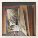 A book is open revealing a path. A girl in a black and white dress is inside the book, coaxing another girl dressed in a similar dress to follow along. A stone path seems to lead into a forest area.