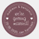 Chic and simple save the date label, with your names and wedding date in white modern typography on a burgundy background, and the text 'we're getting married' in stylish script font. Use these wedding stickers for your wedding gifts, gift bags or as a save the date envelope seal. Exclusively designed for you by Happy Dolphin Studio. If you need any help or matching products, please contact us at happydolphinstudio@outlook.com.