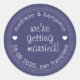 Chic and simple save the date label, with your names and wedding date in white modern typography on a navy blue background, and the text 'we're getting married' in stylish script font. Use these wedding stickers for your wedding gifts, gift bags or as a save the date envelope seal. Exclusively designed for you by Happy Dolphin Studio. If you need any help or matching products, please contact us at happydolphinstudio@outlook.com.