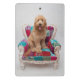 A happy Goldendoodle sitting contently on a colourful, patterned chair. This cute shaggy puppy seems to be larger than the chair but never too big to hold in your arms. With his tongue sticking out, facing the camera in this photo, he would make the perfect companion. Discover lots more cute puppies here on Zazzle with Getty Images.