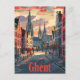Experience the magical transformation of Ghent as the sun sets with our travel ad illustration. This enchanting piece captures the city's historic skyline aglow in the warm hues of sunset. Picture yourself along the picturesque canals, where ancient architecture reflects the golden light, and the city comes alive with a tranquil, timeless beauty. Embark on a journey to Ghent, where every evening unfolds in a symphony of colours and historic horizons.