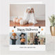 Happy Halloween card featuring a photo collage with paw prints on the front, a skeleton ghost with a jack-o'-lantern inside, and a pumpkin wearing a black witch hat and adorned with orange flowers at the back. Easily personalise this cute Halloween card with your family name and text.