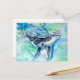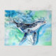 traditional watercolor painting of the ghostly appearance of a humpback whale in blue watercolors on a postcard.