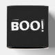 Give your guests a spooky treat or gift in this box. A black box with a white ghost on the front and back. The word BOO! in white text is placed on the top for an extra surprise. This would make the perfect addition to any party, event or even themed Halloween wedding.