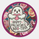 Cute ghost holding a pink heart. Whimsical design bringing two holidays together. Background has varying colours of hearts and roses.