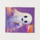 um fantasma amigável segurando uma bandeira. O fantasma é predominantemente branco com sombreamento roxo e tem olhos grandes e expressivos, além de um sorriso largo. A bandeira tem listras horizontais nas cores laranja, branca e roxa. Essa imagem é interessante por representar um fantasma de forma fofa e não ameaçadora, apesar de ser frequentemente associado a temas de Halloween ou assustadores.