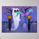 A ghost holding a mask dances by the entrance of a cemetery, flanked by two Jack O'Lanterns.