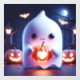 A charming, cartoon ghost stands in the centre of the image, illuminated by the warm glow of a heart-carved pumpkin it holds. The ghost, with its round, blushing cheeks and wide, innocent eyes, exudes a friendly and adorable aura, contrasting the spooky backdrop of a moonlit graveyard. Bats flit across the background, and jack-o'-lanterns with menacing grins flank the ghost, adding a touch of classic Halloween ambiance.