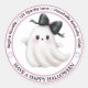A cheerful ghost with a blushing smile and a heart-topped bow floats at the centre of a circular design framed in soft pink. Surrounded by playful ghost icons and festive text, the layout radiates warmth and whimsy—perfect for adding a personal touch to Halloween mailings or seasonal décor. Every detail is fully customisable to match your unique style and spooky spirit.