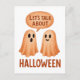 Two cartoon ghosts with different expressions engage in a conversation. Above them, a speech bubble says 'Let's Talk About Halloween.'