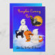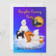 Party invite features two little ghosts and a black cat carving pumpkins while sitting on a cloud. Little vampire bat hovers watching in front of a full moon. Customise the Invitation card front and back area with all your party information.