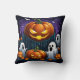 Eerie spirits float amidst carved pumpkins, casting an enchanting glow in a dark Halloween setting with a looming full moon in the background.