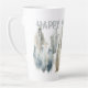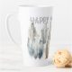Tall latte mug with ghosts and "Happy Halloween" text.  A gathering of ghosts is the image that wraps around this tall white mug.  Text is across the top and can be changed.  Light neutral colours and text is grunge font in light grey.