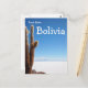 Postcard of a giant cactus on the white salt flats of the Salar de Uyuni in Bolivia with the text: 'Love from Bolivia'.