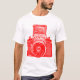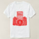 A t-shirt with a giant high contrast, high passed filtered and vectorised image of a vintage East German camera from the 1950s. Creating a strong bold toothy retro screen print. or mediaeval Gothic brass rubbing like effect.
