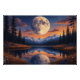 A giant moon dominates the night sky, illuminating snow-capped mountains and reflecting on a calm lake. Tall trees frame the shores, while orange and blue clouds paint the horizon. Stars twinkle around, creating a magical scene that conveys peace and wonder. Perfect for evoking dreams and connections with wild nature, this artwork blends celestial beauty and earthly tranquillity in a single moment.