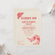 Birthday invitations featuring decorative pink and red "Giddy Up Let's Party" text, illustration of rose, and pink cowgirl boots with hearts. Background is off white.