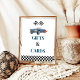 Sign for a child's second birthday party with a racing car motif and a depiction of a blue automobile with flames. "gift and cards" according to the paragraph.