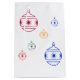 Round ornaments for holiday tree, two large and four small, on each side. Colours of individual globes are blue, green, red, orange.