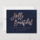 A modern, stylish gift certificate hello beautiful typography with modern hand lettering style brush typography in faux rose gold foil on a trendy and elegant navy blue watercolor background. If you need any customisation, don't hesitate in contacting me