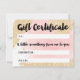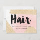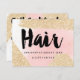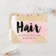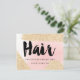 A modern, stylish gift certificate hair artist business card with modern hand lettering style brush typography in a trendy and elegant gold glitter sparkles brushstrokes and pastel pink watercolor.