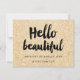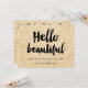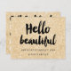 A modern, stylish gift certificate hello beautiful with modern hand lettering style brush typography on a trendy and elegant chic gold glitter sparkles background.