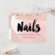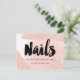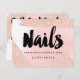 A modern, stylish gift certificate beauty nail technician business card with modern hand lettering style brush typography on a trendy and elegant luxurious rose gold glitter sparkles brushstrokes and pastel pink watercolor.