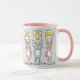 Fun Mug for Mum. Fun Rabbit Design Pink and White Mug with illustration of Rabbits in pink and blue. Mother's Day gift mug. Cute baby rabbits. The rabbits are holding up cards to spell out the word MOM.
