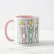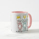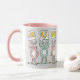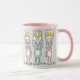 Fun Mug for Mum. Fun Rabbit Design Pink and White Mug with illustration of Rabbits in pink and blue. The rabbits are holding up cards to spell out the word MUM.