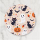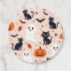 a seamless Halloween pattern featuring cute ghosts, smiling pumpkins, playful black cats, and candy corn. Include whimsical elements like tiny bats and stars for a fun, lighthearted feel. Use a bright colour palette with shades of orange, purple, and pastel accents for a festive yet adorable Halloween vibe.
