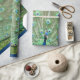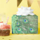 Brilliant blue peacock has his tail feathers spread across the entire surface of the paper.