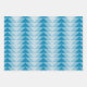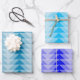 Triangles with semi-opaque transparency are overlapped to form three shades of the underlying background colour. Three background colours are teal blue, sky blue, and dark blue. Pattern of stripes with triangles alternately pointing up and down.